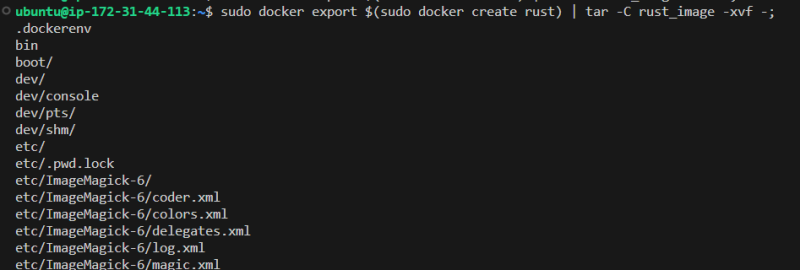 sudo docker export $(sudo docker create rust) | tar -C rust_image -xvf -;