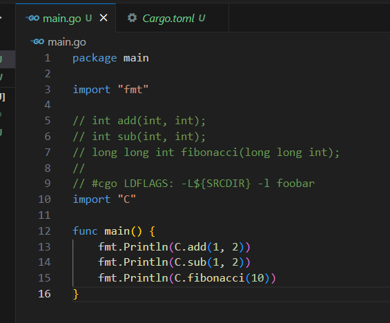 Go는 FFI로 제공하는게 cgo 정도 뿐이라서 상호연결을 하고 싶다면 Rust 코드를 적절한 정적 라이브러리로 빌드한 다음에 그걸 cgo로 꽂아야 한다.
