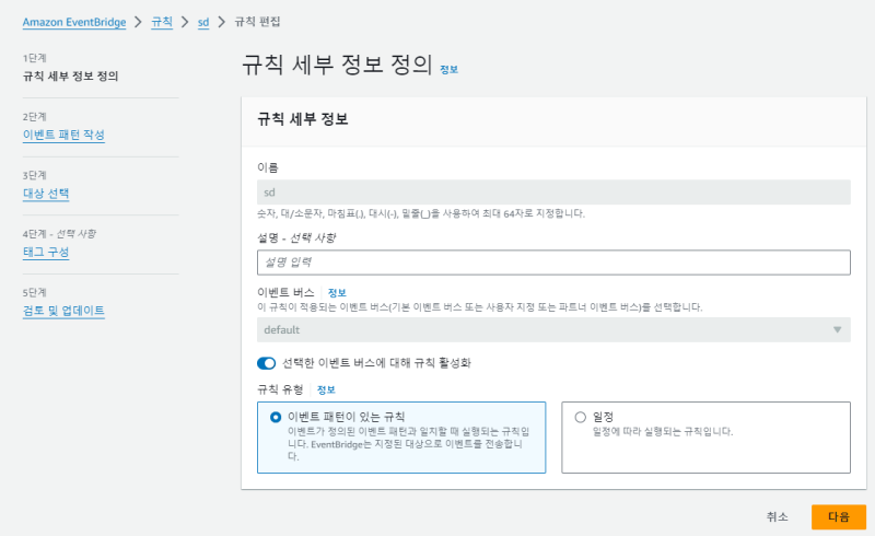 ๊ทธ๋ฆฌ๊ณ eventbridge ๊ท์น์ผ๋ก ํธ๋ฆฌ๊ฑฐ๋ฅผ ๊ฑธ์ด์ค๋ค.