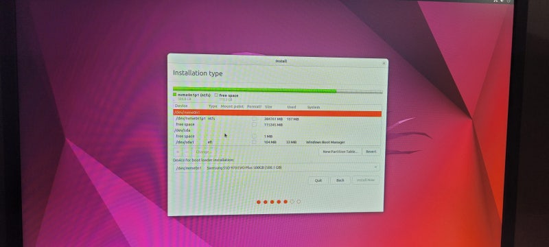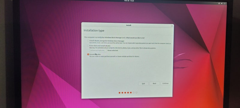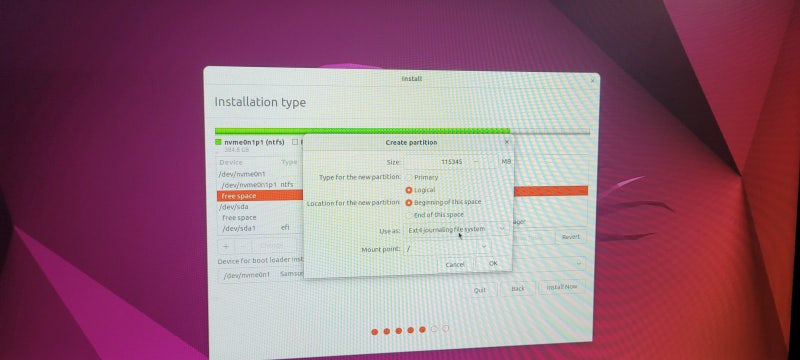 멀티부트로 세팅하는 것이기 때문에, 설치타입은 something else로 해야한다.