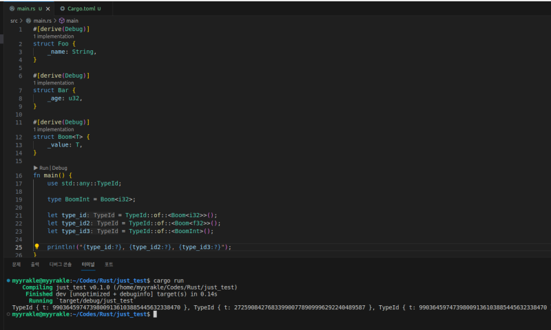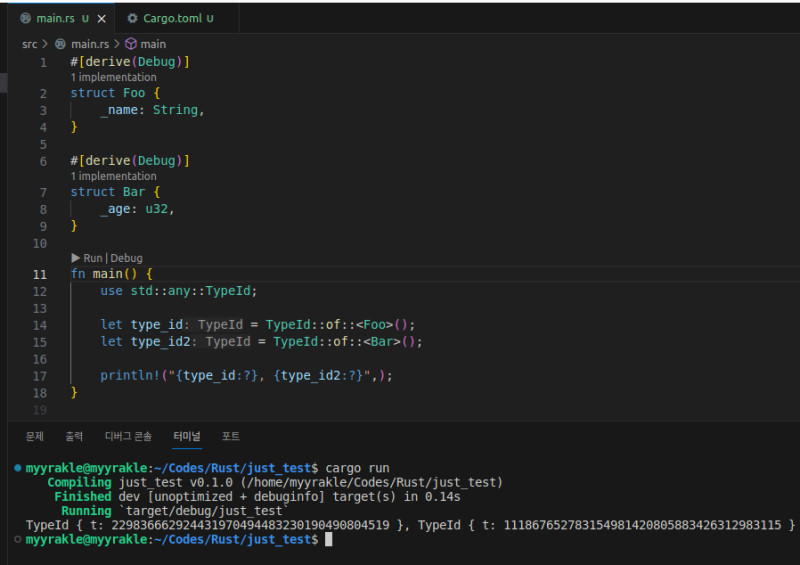 TypeId::of ์ ๋๋ฆญ ํจ์๋ฅผ ์ฌ์ฉํ๋ฉด ํด๋น ํ์ ์ ๋ํ ํ์ ๊ณ ์ ๋ฒํธ๋ฅผ ๊ฐ์ ธ์ฌ ์ ์๋ค.