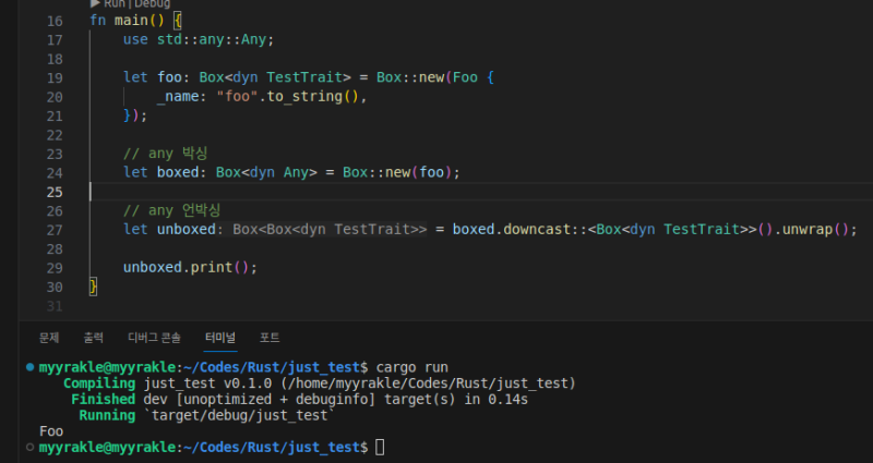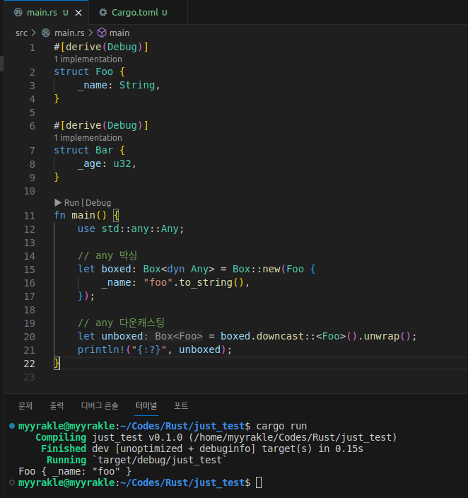 ๋ง์ฝ ๋ฐ์ฑ๋ Any ์ค๋ธ์ ํธ์์ ์ง์ง ํ์ ๊ฐ์ ๊บผ๋ด๊ณ ์ถ๋ค๋ฉด ์ญ์ฐธ์กฐ๋ฅผ ํด์ ์ธ๋ฐ์ฑ๋ dyn Any ์ฐธ์กฐ๋ฅผ ๊ฐ์ ธ์์ผ ํ๋ค.