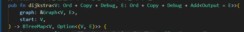 pub fn dijkstra<V: Ord + Copy + Debug, E: Ord + Copy + Debug + Add<Output = E>>(