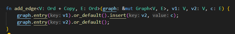 fn add_edge<V: Ord + Copy, E: Ord>(graph: &mut Graph<V, E>, v1: V, v2: V, c: E) {