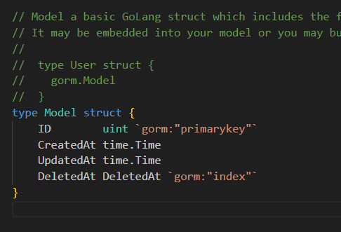 ๋ชจ๋ธ์ gorm.Model๋ง ์๋ฒ ๋ฉํด์ ๊ตฌ์กฐ์ฒด๋ก ์ ์ํ๋ฉด ๋๋ค.