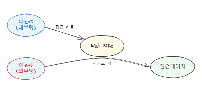 하지만 외부망의 경우에는 미리 구성해놓은 점검 페이지로 이동을 하게끔 한다.