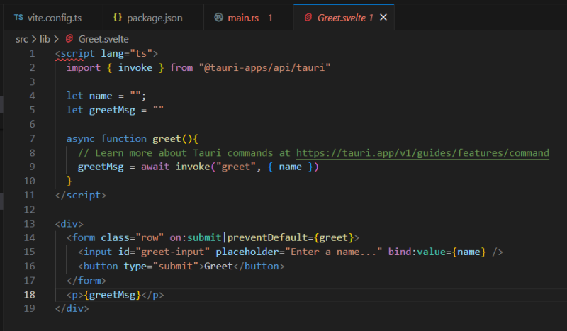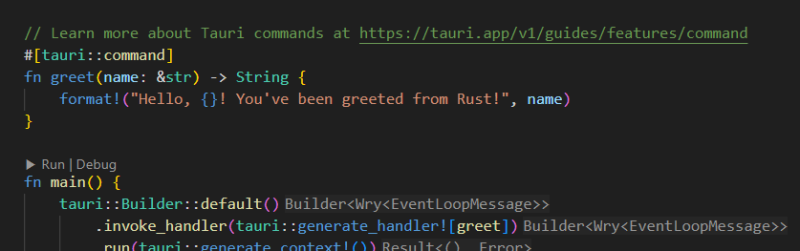 이런식으로 invoke 함수를 통해 내부 Rust 로직을 호출한 것이다. "greet"라는 함수를 호출하면서 name이란 파라미터를 넘겼다.