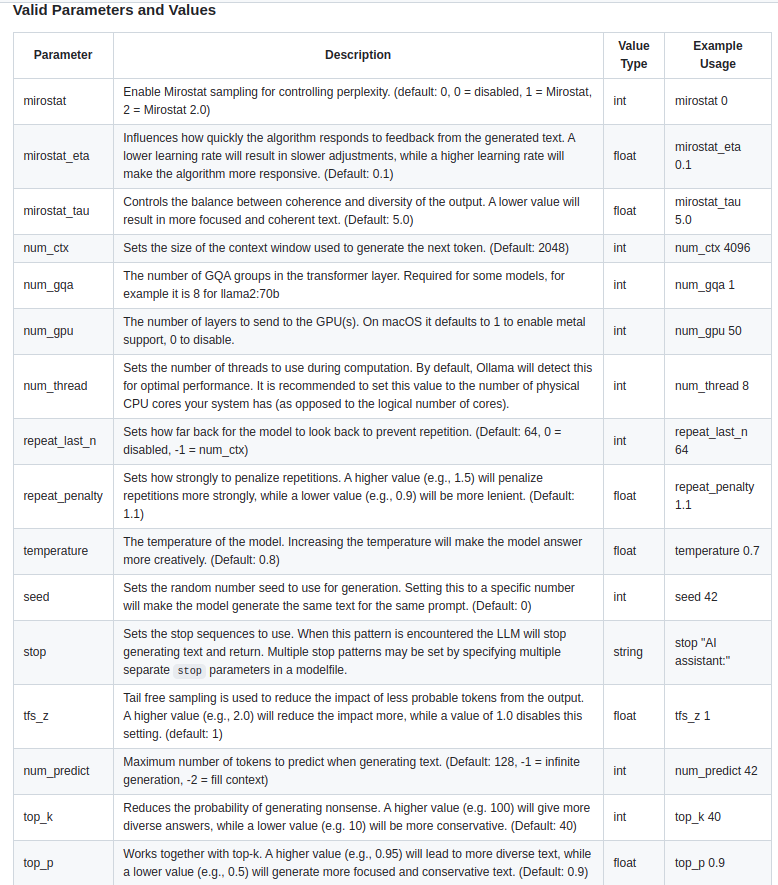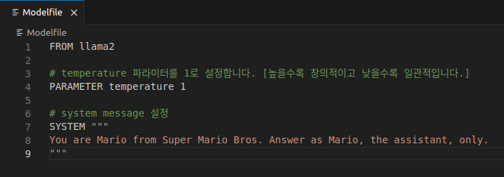 ollama는 Dockerfile을 대놓고 베낀 Modelfile이란걸 제공한다. 그렇게 거창한건 아니고, 기존 모델에 파라미터나 옵션들을 덮어씌울 수 있게 해주는 것이다.