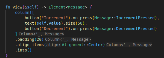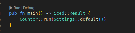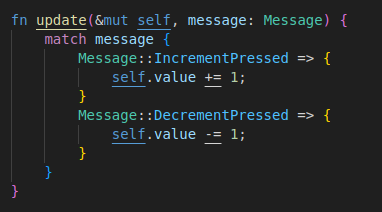 ๊ทธ ๋ค์์ ๋ฉ์ธ์ง๋ค. Elm์ ๋ชจ๋ ๋์์ "์ด๋ฒคํธ"๋ฅผ ํตํด์ ์ฐ๊ฒฐํ๊ณ ์ํธ์์ฉํ๋๋ก ํ๋๋ฐ, Elm์ ๋ฒ ๋ iced๋ ๊ทธ๋ฐ ๋ฐฉ๋ฒ์ ์ทจํ๋ค.