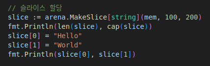 slice := arena.MakeSlice[string](mem, 100, 200)