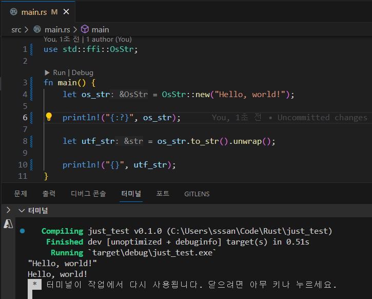 그래서 뭔가 운영체제 정보에서 뭔가를 꺼내오거나, C 함수를 FFI로 사용하거나 할 때는 그 인코딩과 상호작용을 해야할 필요가 있는데, 그럴대 쓰는게 OsString 타입이다.