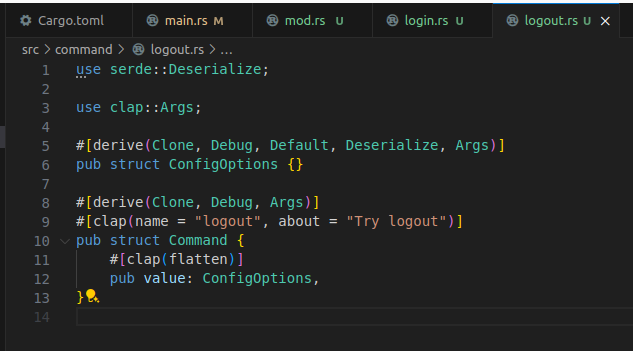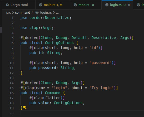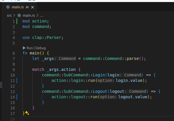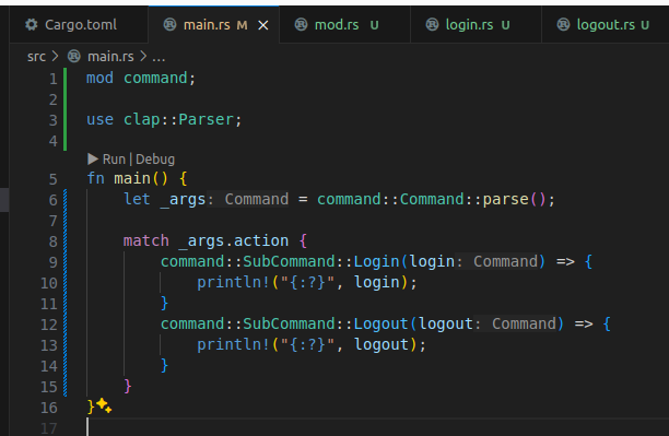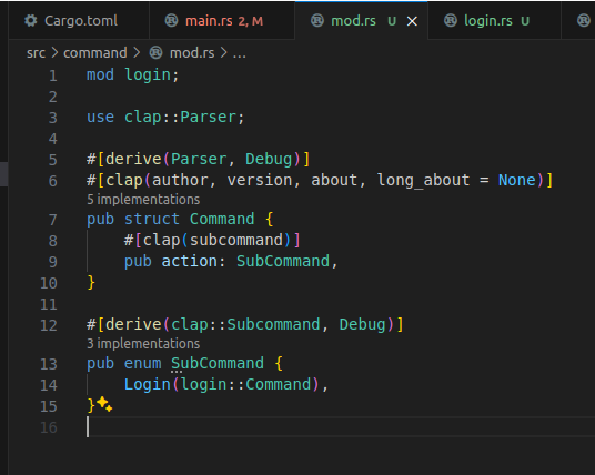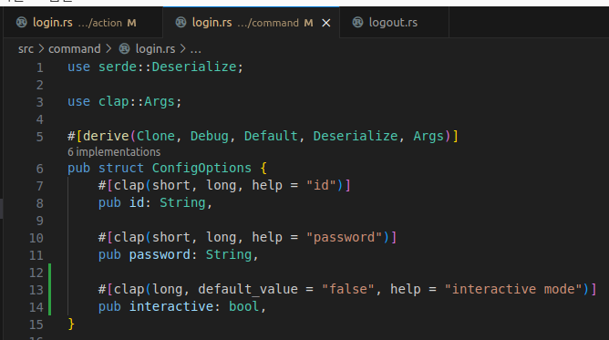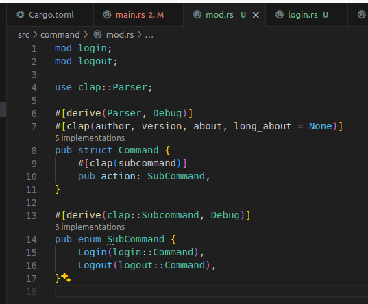 SubCommand enum에는 곧 정의될 로그인과 로그아웃 커맨드가 들어갈 것이다.