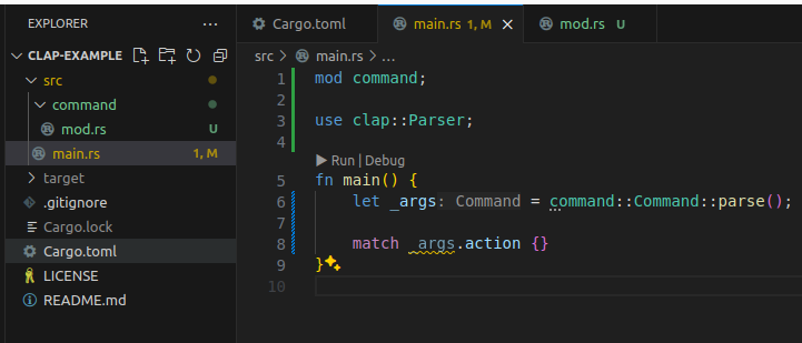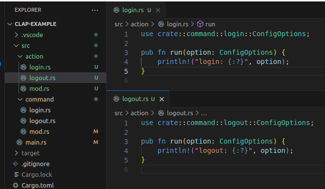 action 모듈을 두고 각 subcommand 동작마다 파일을 하나씩 뒀다.