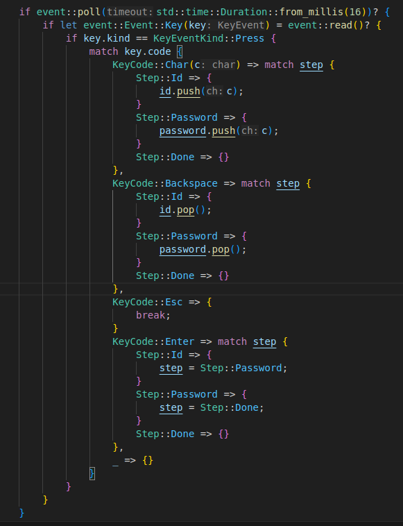 if event::poll(std::time::Duration::from_millis(16))? {