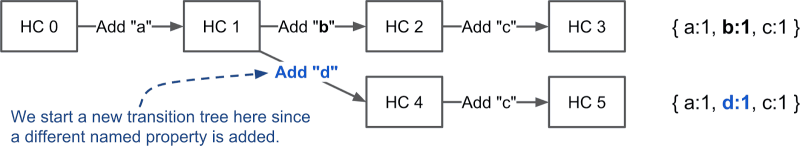 ์๋ก์ด ํค๊ฐ ์ถ๊ฐ๋๋ฉด ๋ค์ ์๋ก์ด Hidden class๋ฅผ ์์ฑํด์ ๋์ํ๋ค.
