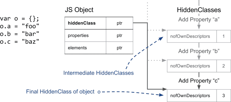 ํฌ๋กฌ, ์ฃ์ง, Node.js ๊ฐ์ V8 ์์ง์์ Object์ ์ํ์ ๋ฐ๋ผ ๋ณํ๋๋ ๋ด๋ถ ๊ตฌ์กฐ๋ฅผ ์ง๋๋ค.