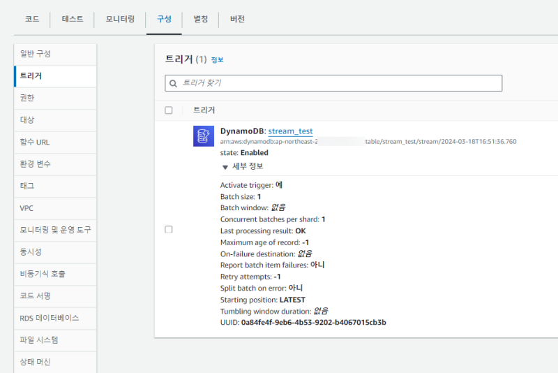 Lambda์ ํธ๋ฆฌ๊ฑฐ ํญ์ผ๋ก ์ด๋ํ๋ฉด Dynamo<>Lambda ๊ฐ ์ํธ์์ฉ ์ค์ ์ ํ์ธํ๊ฑฐ๋ ์ ์ดํ ์ ์๋ค.