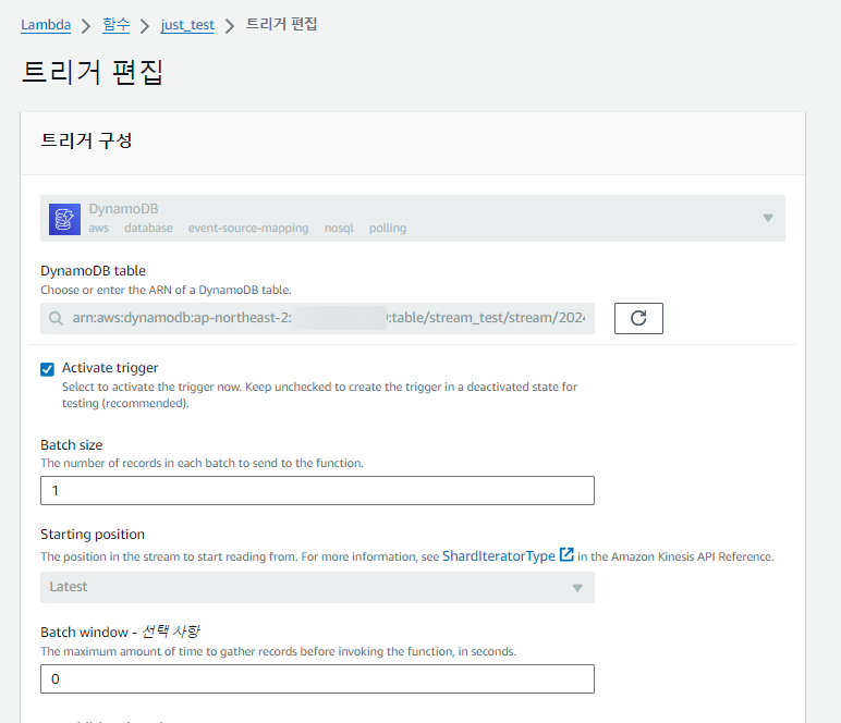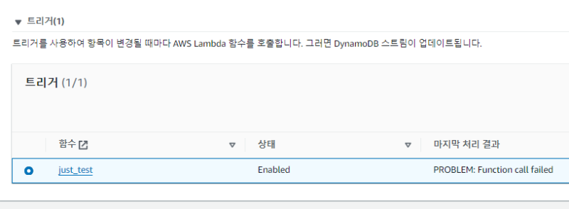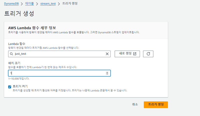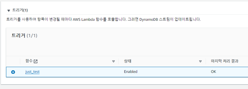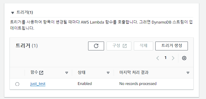 Lambda์ ํธ๋ฆฌ๊ฑฐ ํญ์ผ๋ก ์ด๋ํ๋ฉด Dynamo<>Lambda ๊ฐ ์ํธ์์ฉ ์ค์ ์ ํ์ธํ๊ฑฐ๋ ์ ์ดํ ์ ์๋ค.