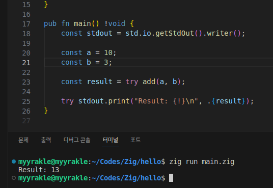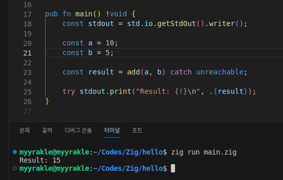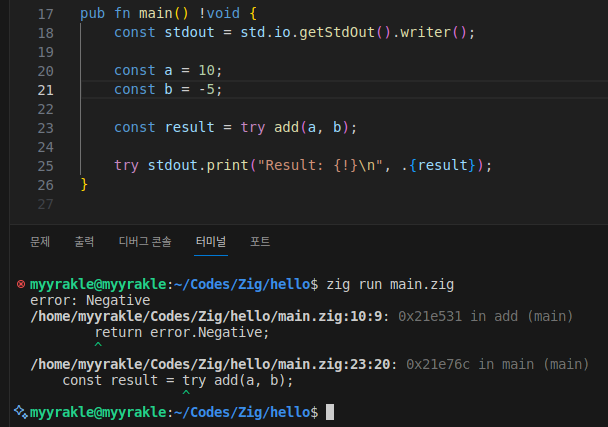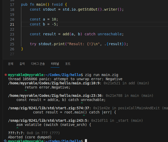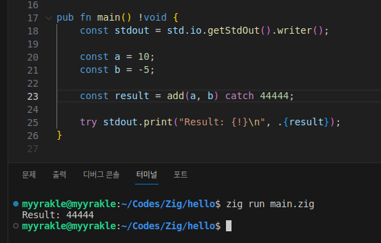 ๋คํํ๋ zig๋ ๊ฐ์ํ๋ ์๋ฌ์ฒ๋ฆฌ ๋ฐฉ๋ฒ๋ก ์ ์ ๊ณตํ๋ค.