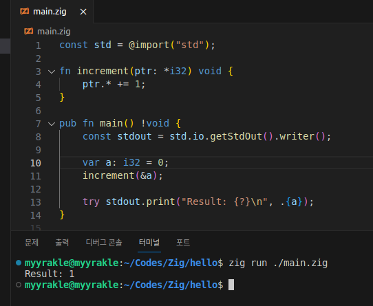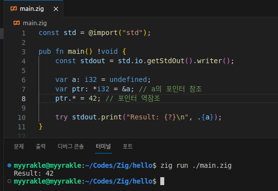 Zig는 C와 동일한 수준의 포인터를 지원한다. C를 사용해본 경험이 있다면 어려움 없이 사용할 수 있을 것이다.