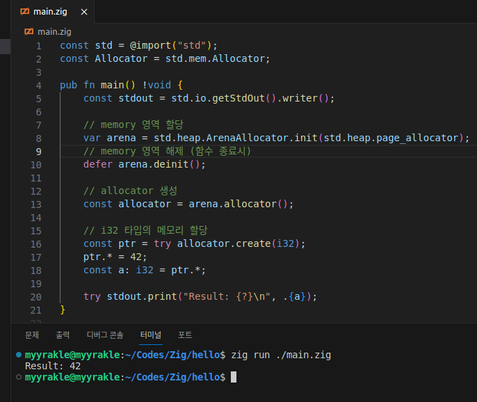 보다시피 arena.deinit() 같은 함수를 이용해서 직접 메모리를 해제해야 한다. Zig는 아무런 책임도 지지 않는다.