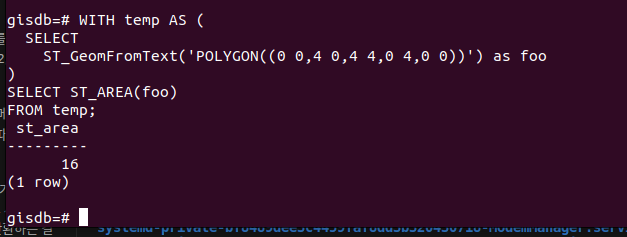 ST_AREA는 전달받은 다각형에 대해서 그 면적을 계산해주는 함수다. Polygon 형태 데이터에 대해서만 동작한다. 그 외의 데이터 포맷에 대해서는 0을 반환한다.