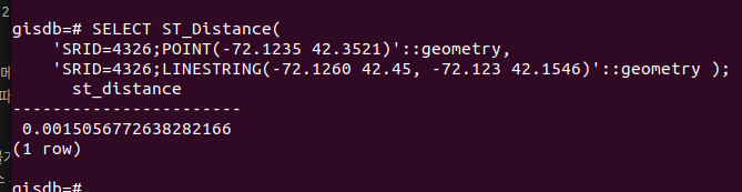 ST_DISTANCE는 파라미터로 도형 2개를 받고, 그 거리를 계산해주는 간단한 기능만을 갖고 있다.