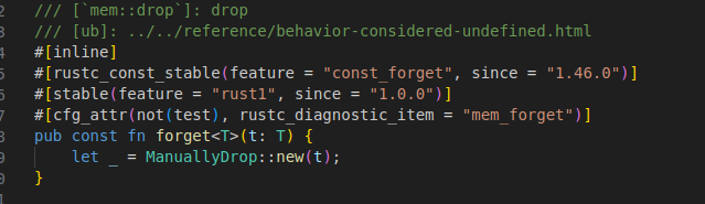 아무튼 일상적으로 사용할만한 기능은 아니다. FFI를 하면 drop 방지가 필요할 수도 있긴 한데, 그렇더라도 ManuallyDrop 객체를 직접 생성해서 직접 drop을 제어하는 것이 바람직한 사용 형태다.