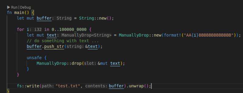 ManuallyDrop라는 이 특수한 객체는 컴파일러에게 drop 소멸자를 호출하지 않도록 명령한다. 소멸자를 호출하지 않으니 힙 할당이나 파일 정리 등 cleanup 작업을 일괄 하지 않는 것이다.