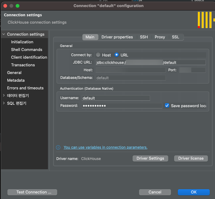 아무튼 clickhouse의 TCP 기본 포트는 8123이다. 기본 스키마와 USERNAME은 default다.