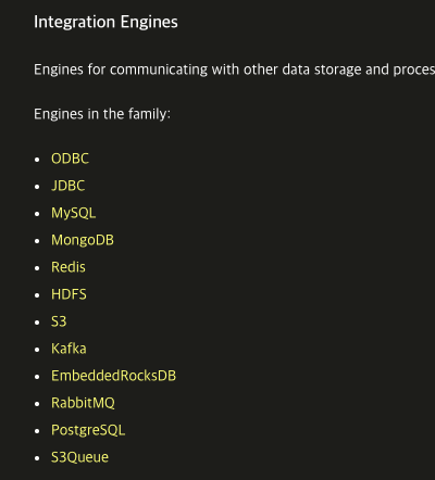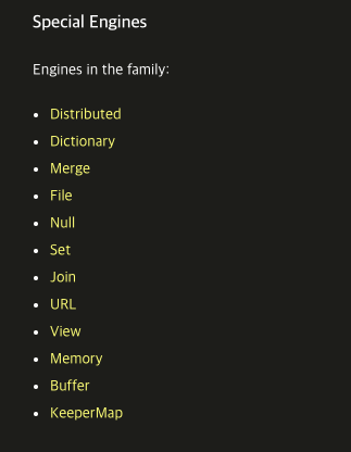 Clickhouse๋ ์ฉ๋์ ๋ฐ๋ผ์ ์๋นํ ๋ค์ํ ํํ์ ์์ง์ ์ ๊ณตํ๋ค.