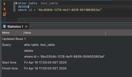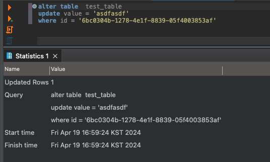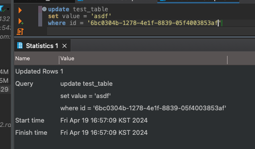 일단 DBeaver 같은 SQL 에디터들에서는 기존 SQL들과 동일한 형태로 Update나 Delete를 수행할 수 있다.