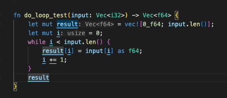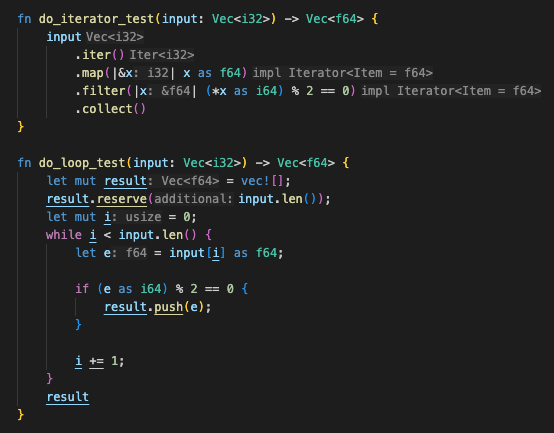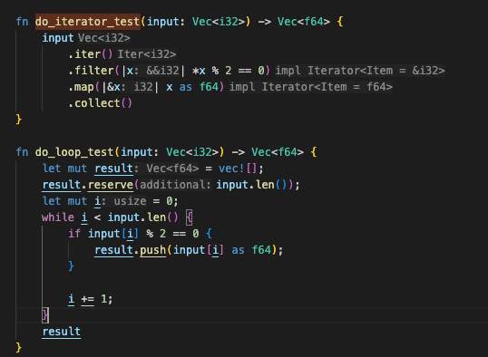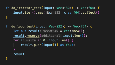 ๊ทธ๋ฅ i32 ๋ฒกํฐ๋ฅผ f64 ๋ฒกํฐ๋ก ์นํํ๋ ๊ฐ๋จํ ์ฝ๋๋ฅผ loop ๋ฒ์ ๊ณผ iterator ๋ฒ์ ์ผ๋ก ๊ฐ๊ฐ ์์ฑํด๋ดค๋ค.