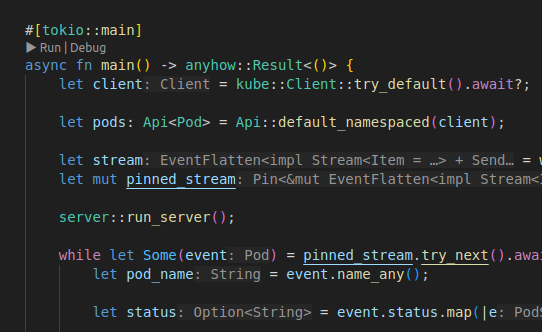 let pods: Api<Pod> = Api::default_namespaced(client);