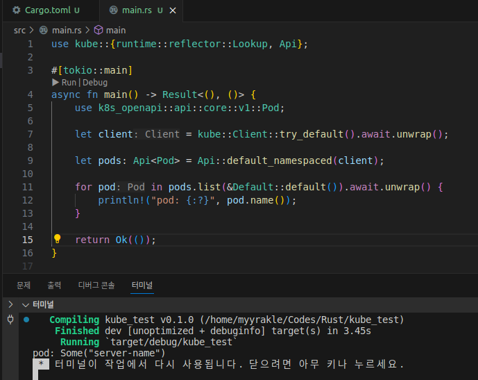 먼저 try_default를 통해서 클라이언트를 가져온다. 이러면 실제 pod 환경에서는 스스로의 접속정보를 가져온다.