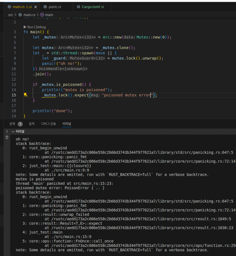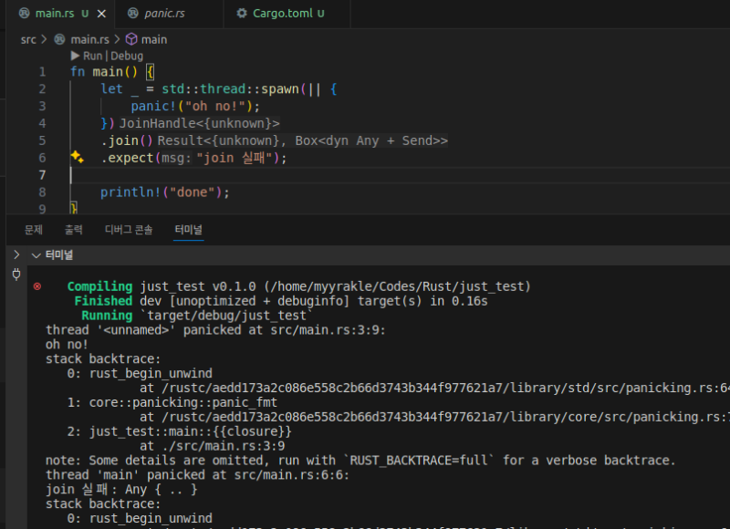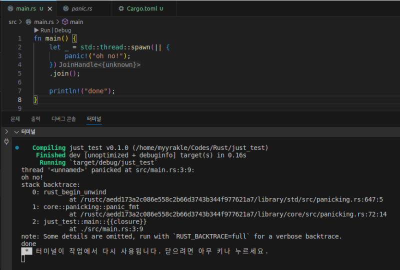 ๋คํํ๋ rust์์๋ ์ค๋ ๋ ๋ด์์ ํจ๋์ด ๋ฐ์ํ๋ค๊ณ ํด์ ๋ฉ์ธ ํ๋ก๊ทธ๋จ์ด ์ค๋จ๋์ง๋ ์๋๋ค.