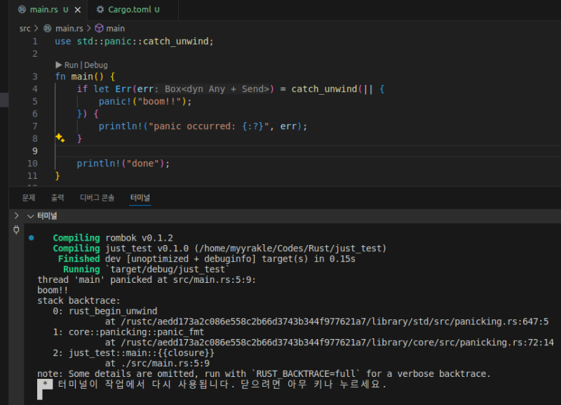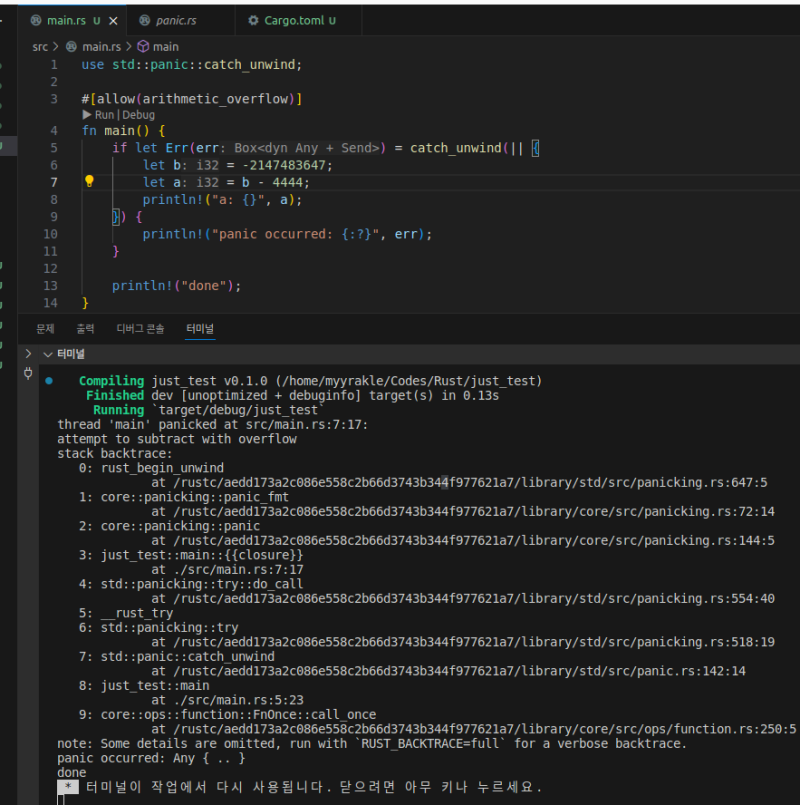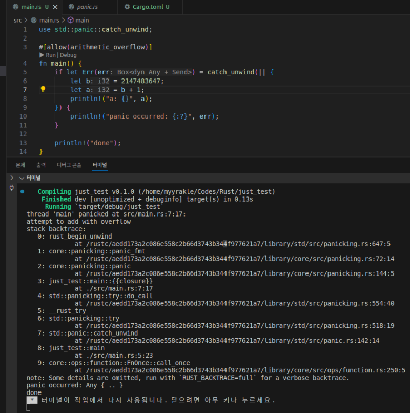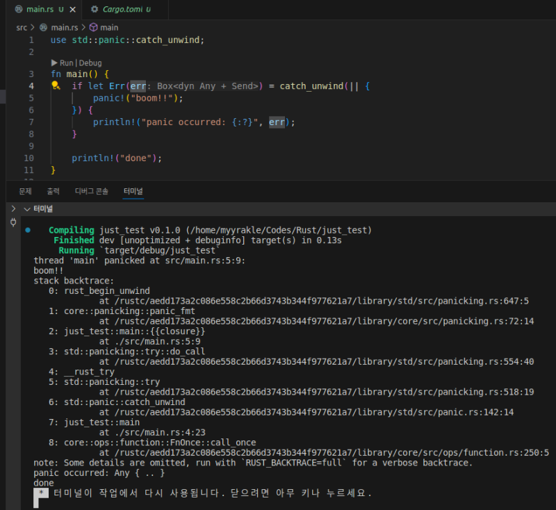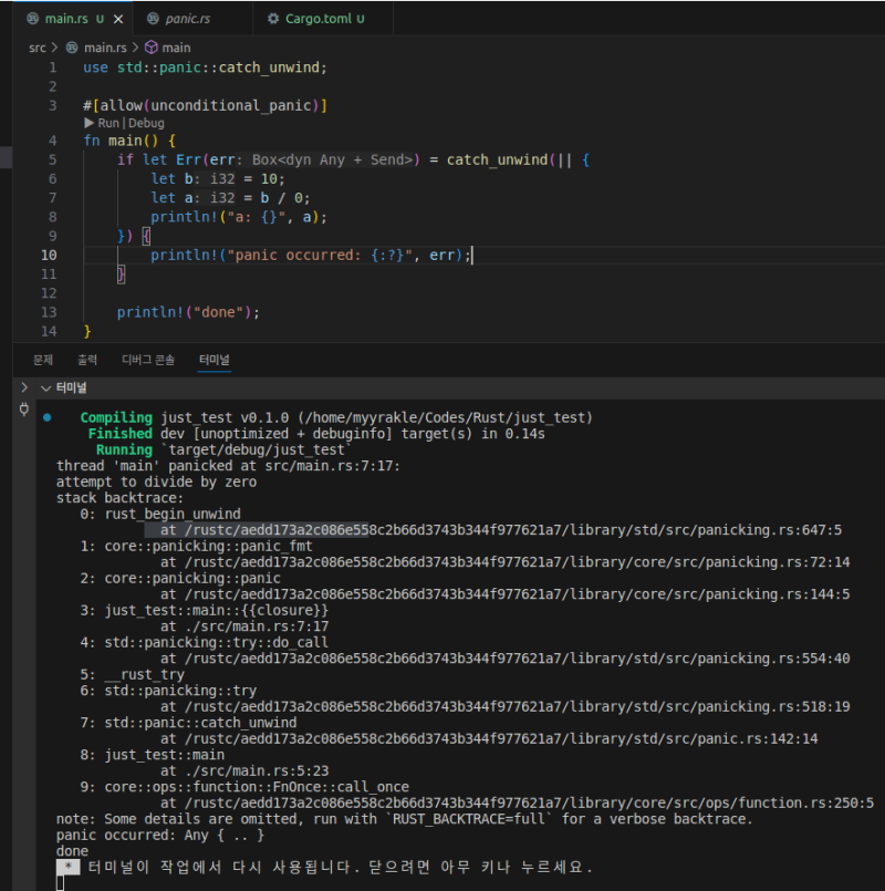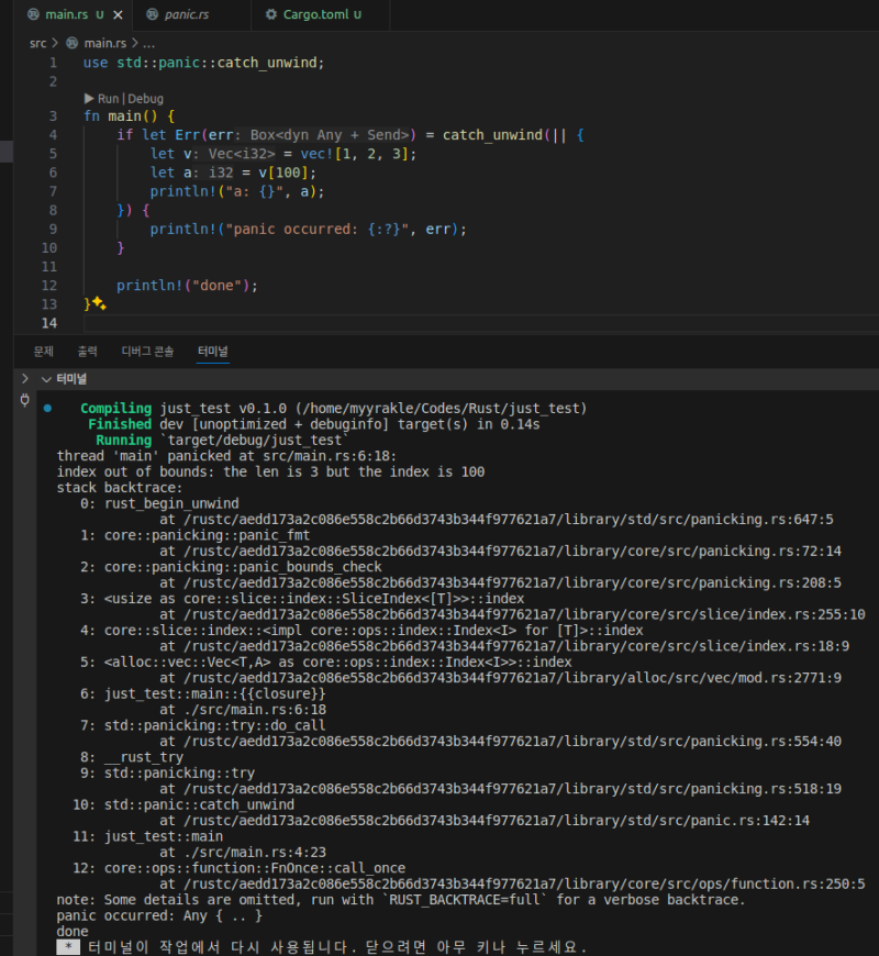 rust์ panic์ ์ฌํ ์ธ์ด๋ค์ try-catch์๋ ์ ์ฌํ ๋ถ๋ถ์ด ์๋ค.