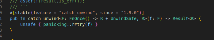 ๊ทธ๋ฌ๋ฉด ์ด์ catch_unwind ๊ฐ์ ๊ฒ๋ ๋จนํ์ง ์๊ณ ๋ฐ๋ก ์ค๋จ๋๋ ๊ฒ์ ํ์ธํ ์ ์๋ค.