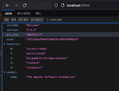 ๋ค์๊ณผ ๊ฐ์ด _all_dbs๋ฅผ ์กฐํํ๋ฉด ์ ์ฒด ๋ฐ์ดํฐ๋ฒ ์ด์ค ๋ชฉ๋ก์ ์กฐํํ ์ ์๋ค.