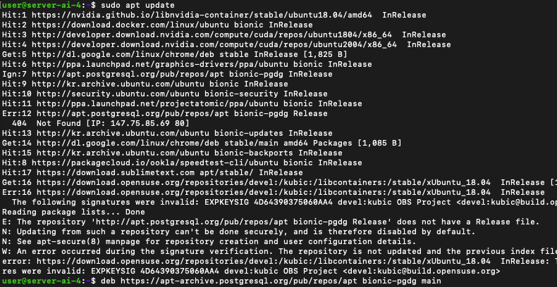 E: The repository 'http://apt.postgresql.org/pub/repos/apt bionic-pgdg Release' does not have a Release file.