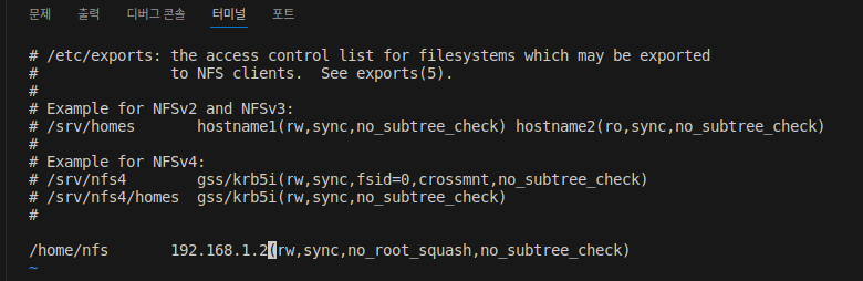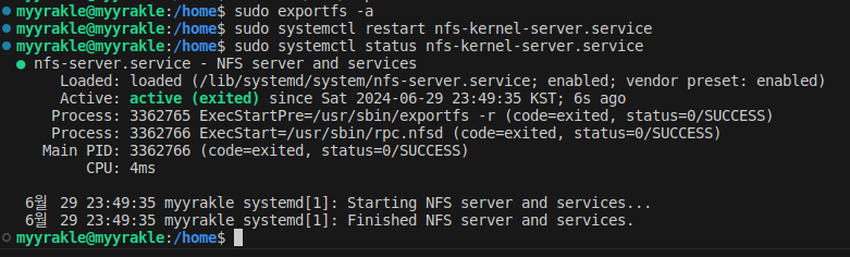 그리고 다음 명령을 사용해서 nfs 서버에 적용하고, 시작한다.