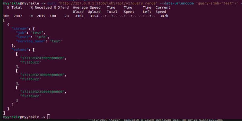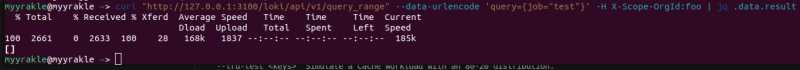 curl "http://127.0.0.1:3100/loki/api/v1/query_range" --data-urlencode 'query={job="test"}' -H X-Scope-OrgId:foo | jq .data.result