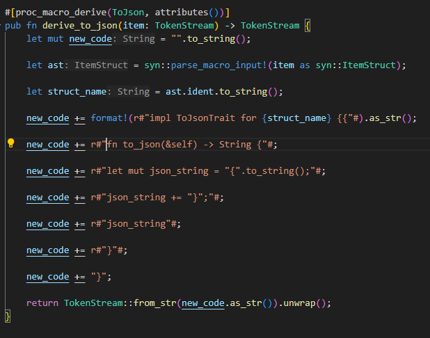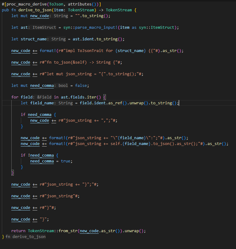 new_code += r#"fn to_json(&self) -> String {"#;