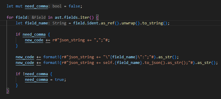 new_code += r#"json_string += ",";"#;