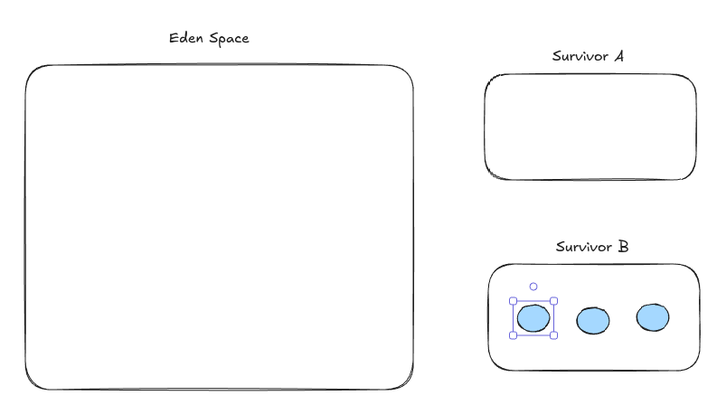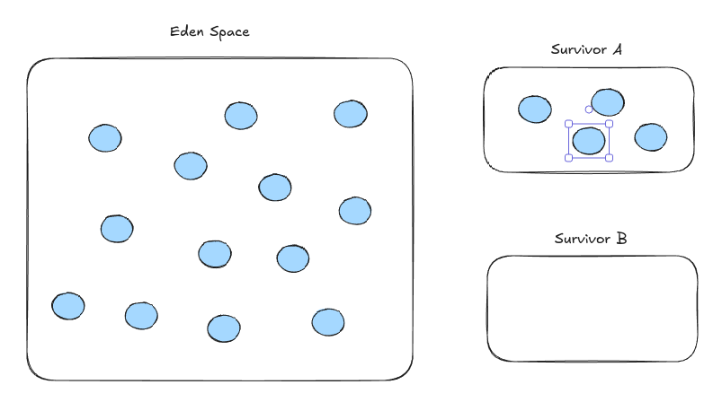 일단 처음에 메모리를 쌓을때는 Eden 하나와 Survivor 하나에만 메모리를 쌓는다.