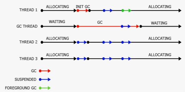 ์ผ๋ฐ GC๊ฐ ์ผ๋ฐ์ ์ผ๋ก ๋ชจ๋ ํ๋ก๊ทธ๋จ์ ์ฐจ๋จํ๋ Foreground GC๋ฅผ ๋๋ฆฌ๋ ๊ทธ๊ฒ์ด๊ณ , Background GC๊ฐ ๋ถ๋ถ์ ์ผ๋ก๋ง ์ ์ง๋ฅผ ๋๋ฆฌ๋ ๊ฒ์ด๋ค.