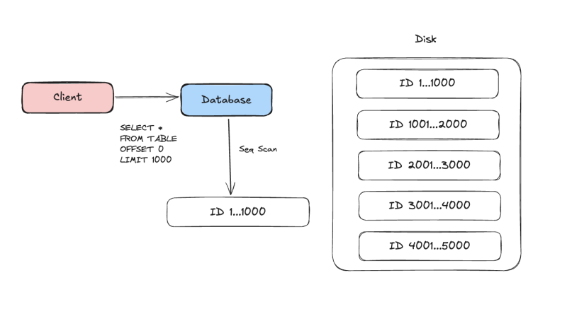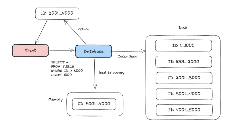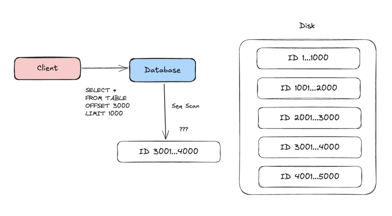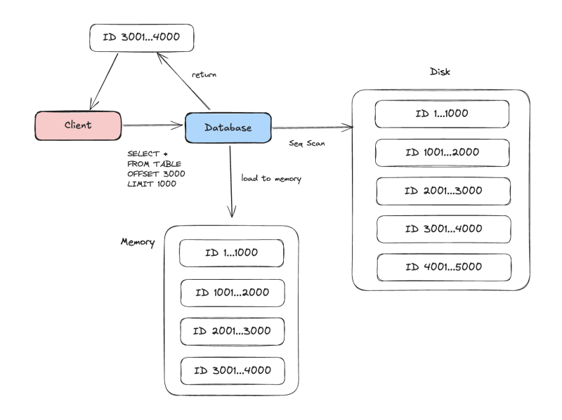 RDB의 경우에는 LIMIT/OFFSET이 가장 마지막에 처리되는 프로세스고, 애초에 DB 입장에서는 디스크에서 데이터를 로드하지 않고서는 3000번째 데이터가 뭔지를 알 수가 없다.