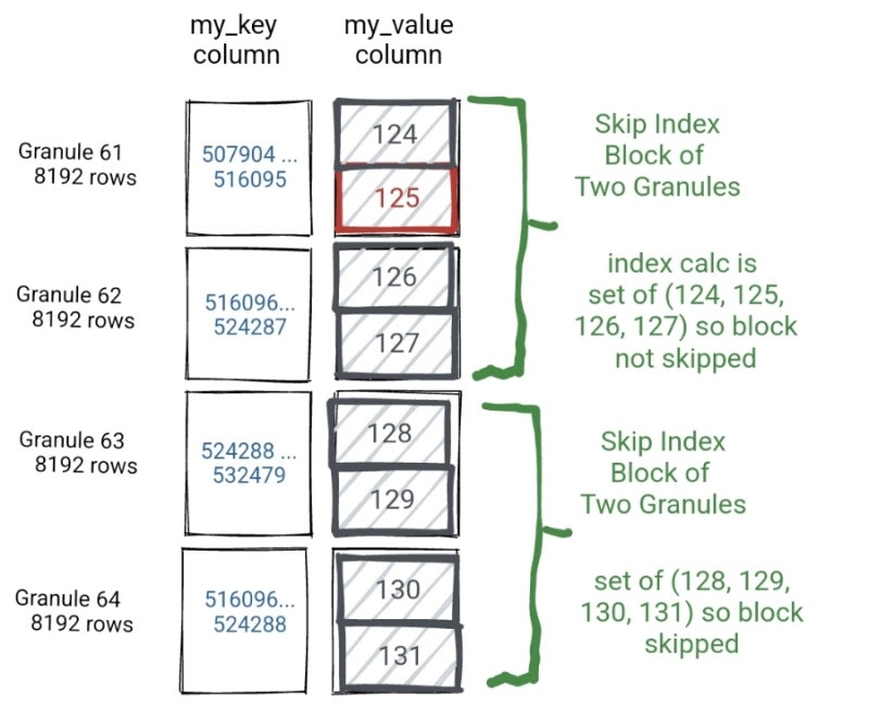 skipping index는 granule을 또 몇개를 묶어서 블럭-그룹으로 만들고 관리한다.