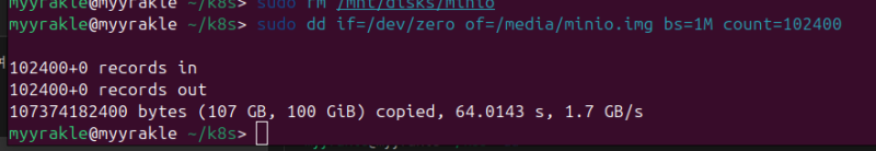 sudo dd if=/dev/zero of=/media/minio.img bs=1M count=102400