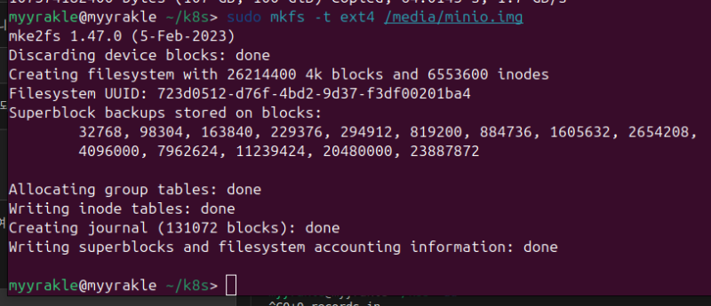 sudo mkfs -t ext4 /media/minio.img